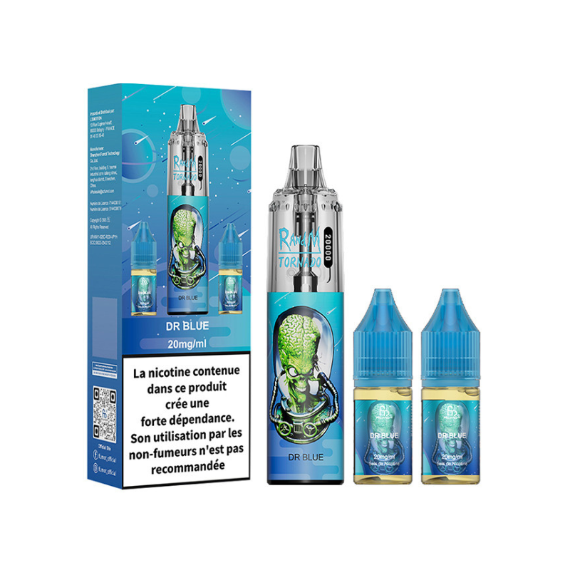 Chaque kit est rechargeable, délivre jusqu'à 20 000 bouffées et intègre une résistance mesh en 1.0ohm ainsi qu'un airflow réglable. La puff s'accompagne de deux fioles en 10ml de la saveur Dr Blue, proposée en 20mg/ml de liquide aux sels de nicotine.