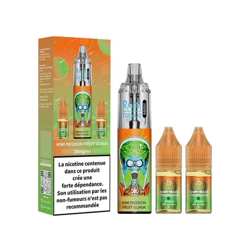 Chaque kit est rechargeable, délivre jusqu'à 20 000 bouffées et intègre une résistance mesh en 1.0ohm ainsi qu'un airflow réglable. La puff s'accompagne de deux fioles en 10ml de la saveur Kiwi Passion Fruit Guava, proposée en 20mg/ml de liquide aux sels de nicotine.
