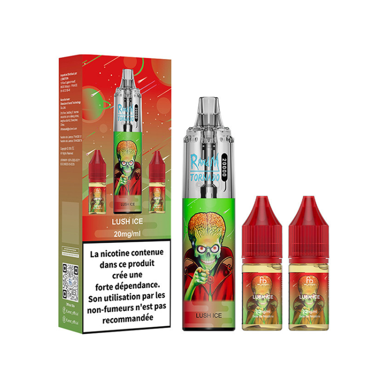 Chaque kit est rechargeable, délivre jusqu'à 20 000 bouffées et intègre une résistance mesh en 1.0ohm ainsi qu'un airflow réglable. La puff s'accompagne de deux fioles en 10ml de la saveur Lush Ice, proposée en 20mg/ml de liquide aux sels de nicotine.