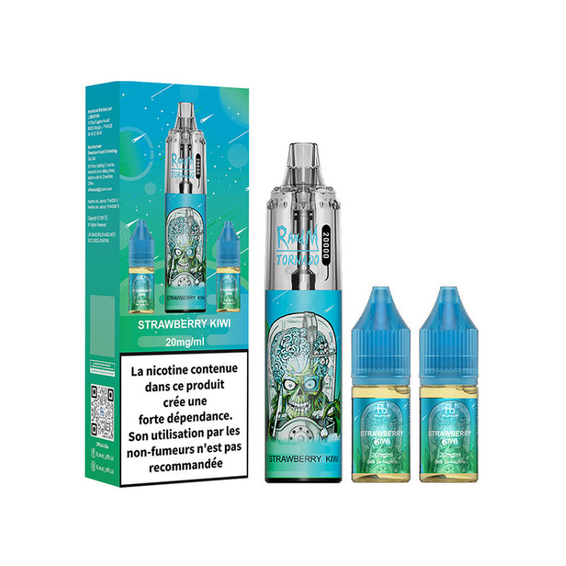 Chaque kit est rechargeable, délivre jusqu'à 20 000 bouffées et intègre une résistance mesh en 1.0ohm ainsi qu'un airflow réglable. La puff s'accompagne de deux fioles en 10ml de la saveur Strawberry Kiwi, proposée en 20mg/ml de liquide aux sels de nicotine.